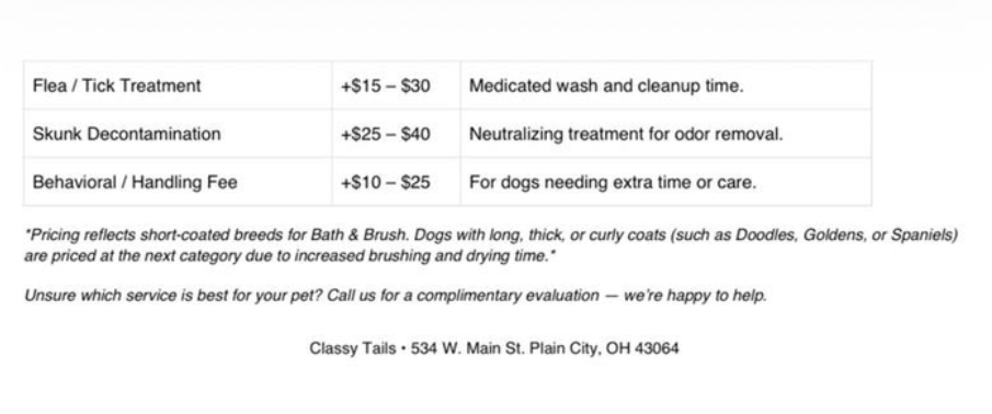 (740) 730-1318Our services are customized to each pet based on coat type, condition, temperament, and the time required, so all prices listed are starting ranges.