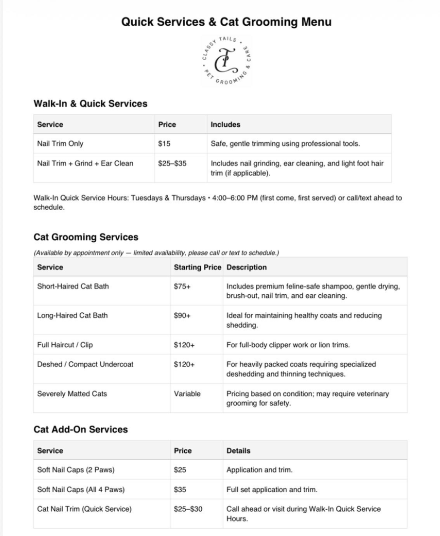 SUN: By Appointment OnlyCopyright © 2026 Classy Tails All Rights Reserved. Sitemap. Accessibility Statement